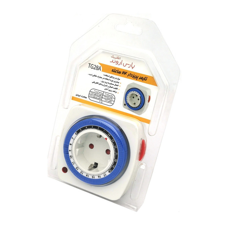 تایمر 24 ساعته پریزی پارس اروند ساخت کشور ایران میباشد. این تایمر قطع و وصل خودکار برق در واقع یک دستگاه زمانسنج است که میتواند در ساعات و دقیقههای مشخص که شما تعیین میکنید جریان برق را قطع یا وصل کند. به سخن دیگر این دستگاه را شاید بتوان یک پریز برق تایمردار نامید. محصول فوق برای مصارف مختلفی طراحی و ساخته شده که برخی از آنها عبارتند از: لوازم برقی داخل آشپزخانه، آکواریوم ، پکیج ، پمپهای آب ، تابلوی مغازه، مودم اینترنت و سایر مصارفی که نیاز به کنترل تحت زمان خاصی دارند. با استفاده از این محصول شما می توانید مویایل خود را با خیال راحت هنگام خواب به شارژ بزنید و بر اساس زمان دلخواه آن را تنظیم نمایید تا شارژ شود. روش تنظیم تایمر به این صورت است که : ابتدا حلقه ی پین های تایمر را به سمت عقربه های ساعت بچرخانید تا فلش قرمز رنگ روی زمان فعلی ، دقیق تنظیم شود سپس تایمر را به برق وصل کنید، هر کدام از پین های آبی رنگ 15 دقیقه میباشد که میتوانید با فشار دادن به سمت پایین ، تنظیم کنید که تایمر در این 15 دقیقه خروجی بدهد.