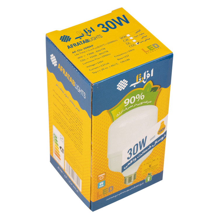 لامپ ال ای دی 30 وات استوانه افراتاب مدل AF-CU-30WAP روشنایی معادل 200 وات لامپهای رشتهای دارد. شدت روشنایی لامپ استوانه در رنگ نور آفتابی معادل 2700 لومن و در رنگ نور مهتابی برابر 2900 لومن است. سرپیچ این محصول E27 است، سرپیچ معمولی و مناسب نورپردازی منازل و ادارات است. در ساخت بدنه این محصول از مواد پلاستیکی استفاده شده و نشکن است. 30 وات ال ای دی افراتاب بسیار کم مصرف (رده انرژی A+) و وزن آن 350 گرم و در ابعاد 10×18 سانتیمتر ساخته میشود. با توجه به بهرهگیری از تکنولوژی ال ای دی SMD در محصول، دارای طول عمر تقریبی 25000 ساعت است. زاویه تابش این مدل 230 درجه است.