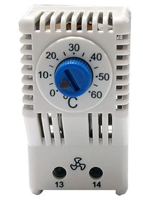 - ترموستات فن: خروجی این کالا یک کنتاکت 10آمپری با تیغه باز (NO) بوده و به فن وصل میشود، که با رسیدن دمای تابلو، به درجه حرارت تنظیم شده، خروجی رله بسته شده و فن شروع بکار میکند تا هوای داخل تابلو خنک شود. پیچ تنظیم این محصول آبی رنگ است.